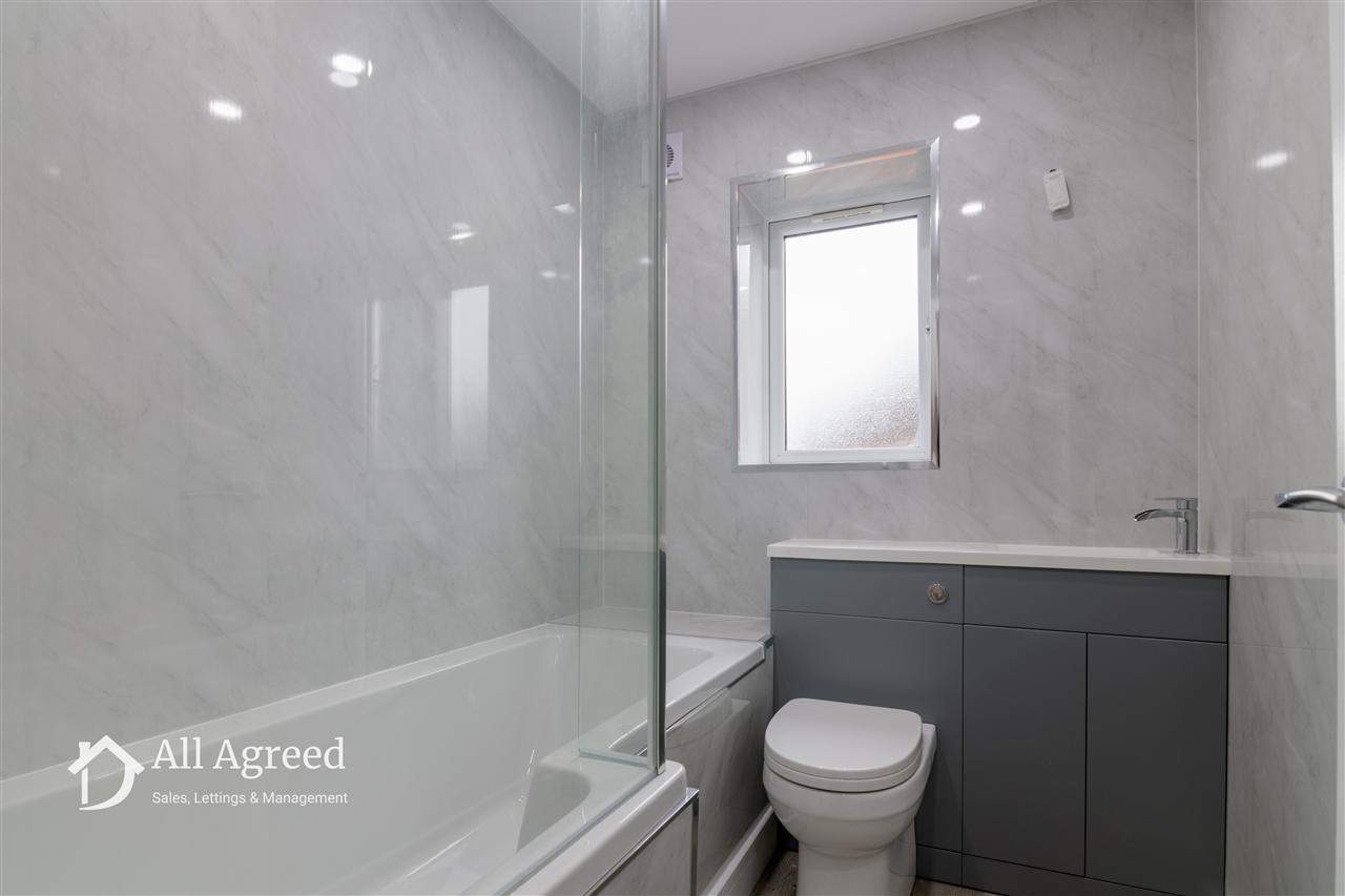 Having a four piece suite with double ended bath, shower cubicle with mains water fed shower, vanity unit with wash basin and WC, chrome effect heated towel rail, storage eaves, extractor fan and uPVC double glazed window to the front elevation.