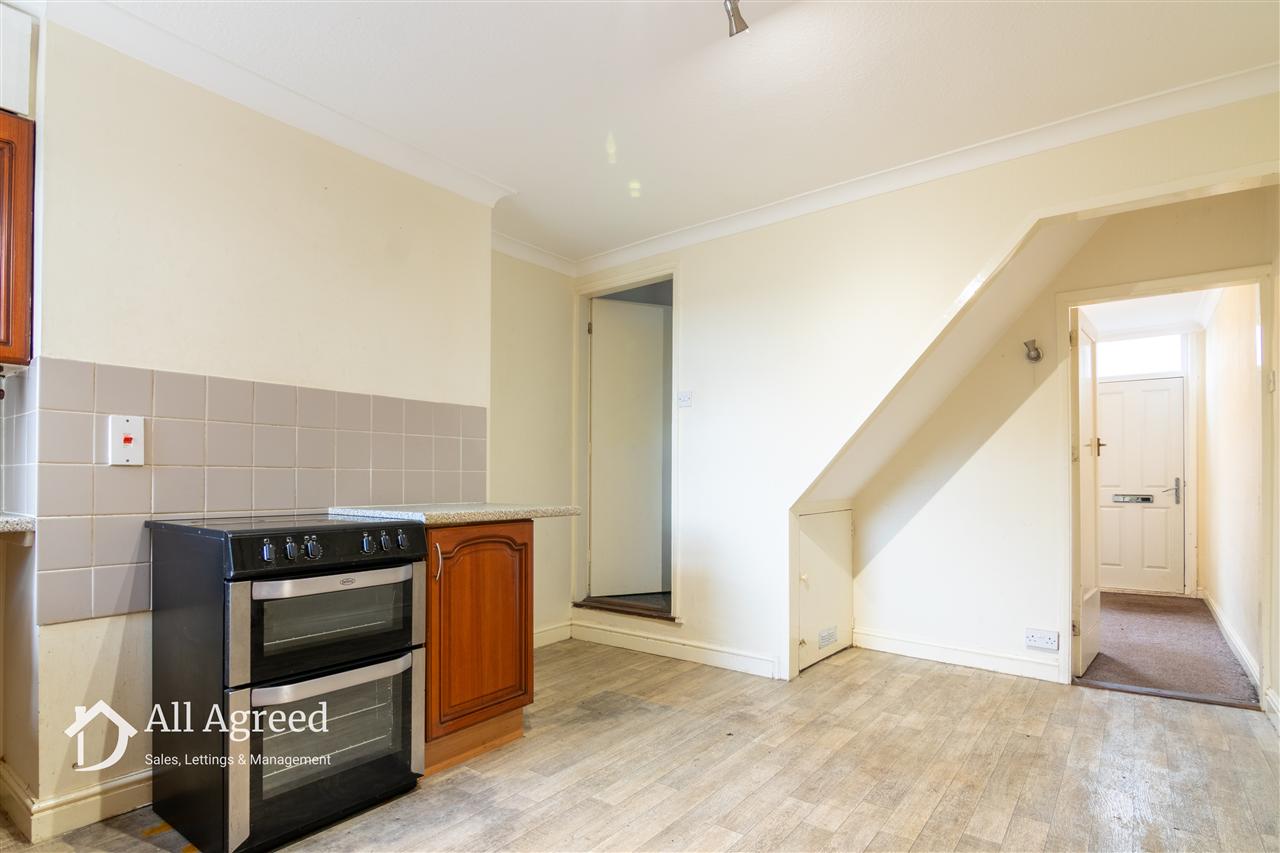 Having a range of wall and base units with rolled edge work tops, sink unit with mixer tap, tiled splash backs, free standing electric cooker with four ring hob, under-stairs cupboard, uPVC double glazed window to the rear elevation and central heating radiator