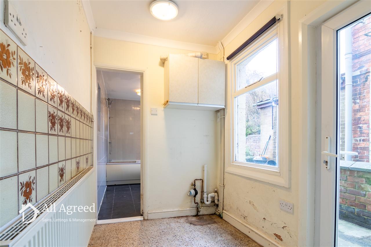 Part tiled walls, tiled floor, plumbing for washing machine, wall cupboard, central heating radiator, uPVC double glazed rear access door and single glazed window to side elevation