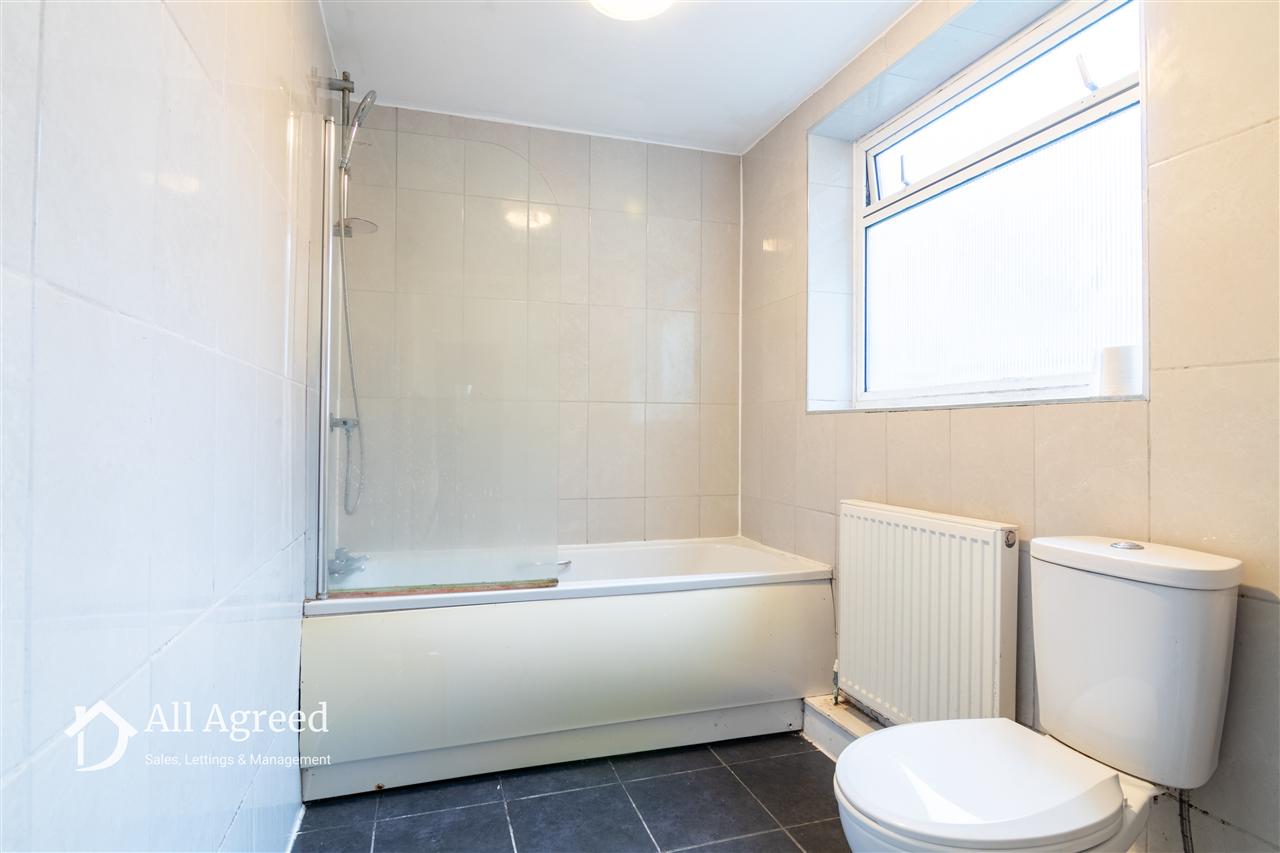 Having a white three piece suite comprising panelled bath with mains powered shower and glass screen, low flush WC and pedestal wash basin, fully tiled walls, tiled floor, extractor fan, central heating radiator, heated chrome effect towel rail, single glazed opaque window and double glazed opaque window to side elevation