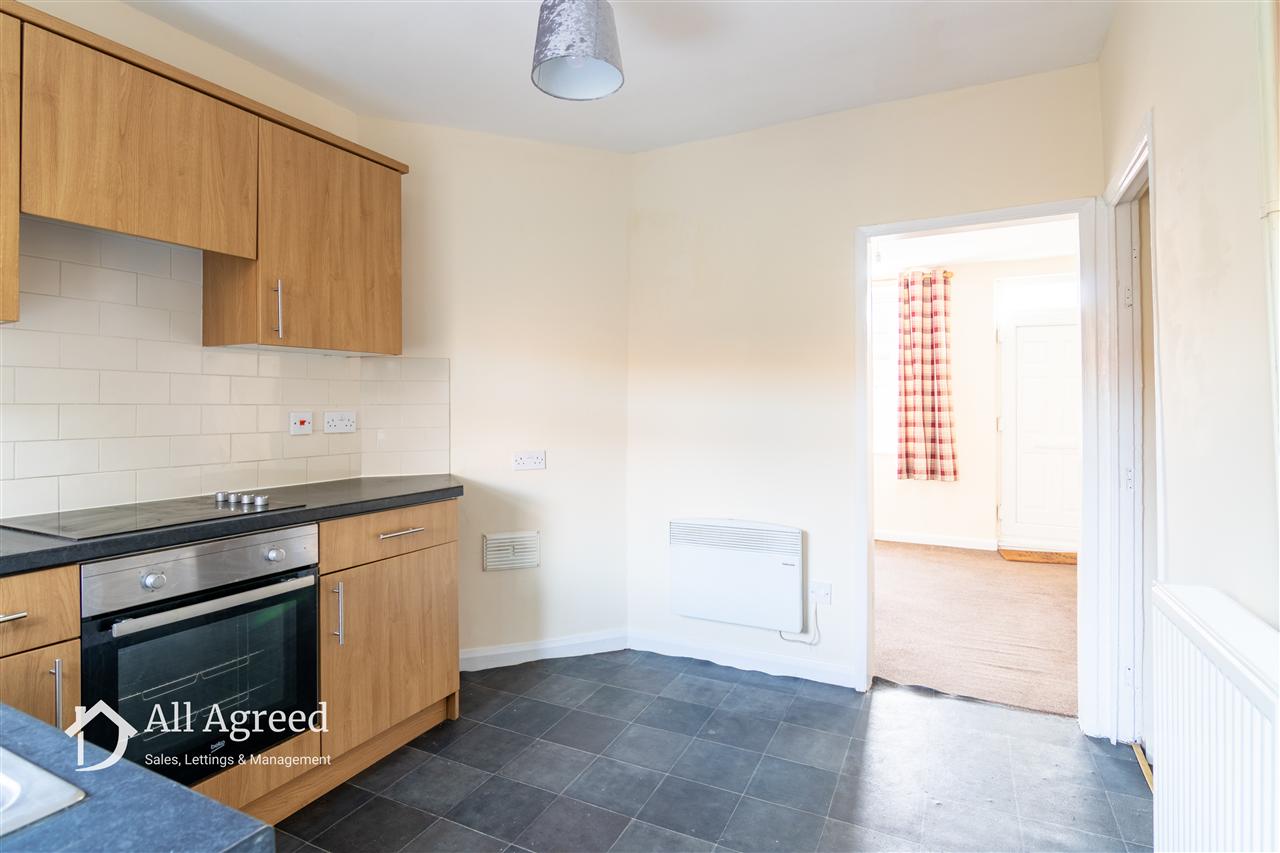 Having a range of modern wall and base units with rolled edge worktops and complimentary splash back tiling, stainless steel sink unit with mixer tap, appliance space for washing machine, built-in electric over, four ring electric hob with concealed extractor above, central heating radiator, electric panel heater, under-stairs storage area and uPVC double glazed window and door to the rear elevation.