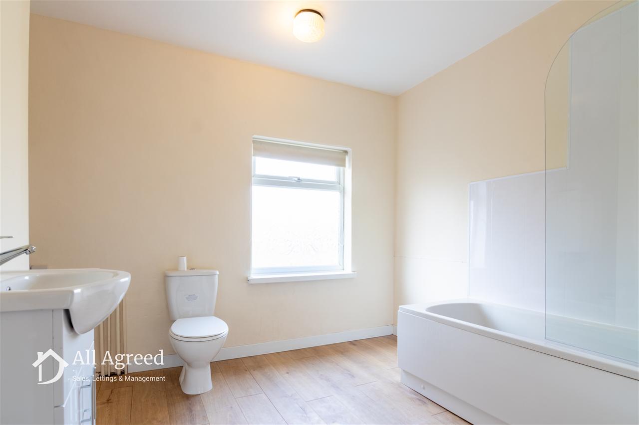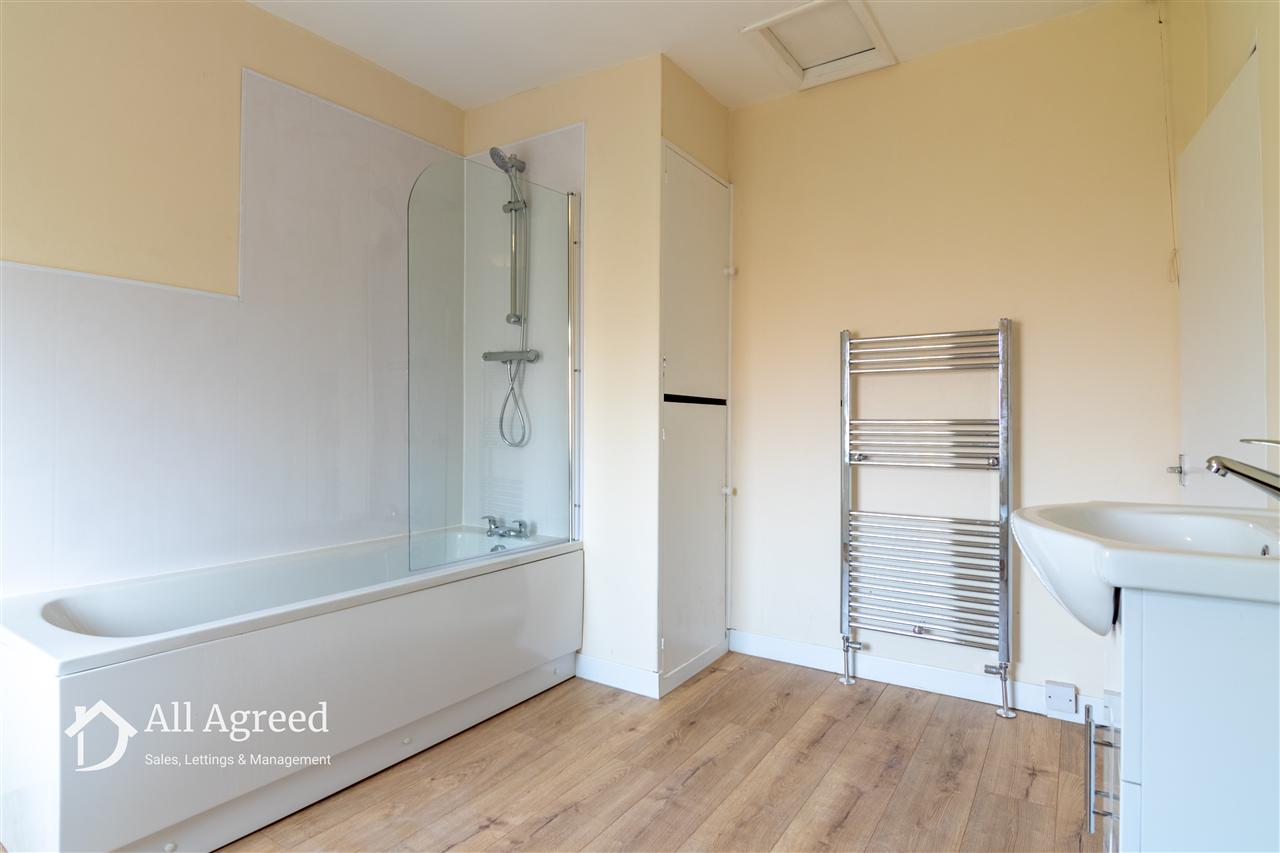 Having a NEW three piece suite comprising panelled bath with mains thermostatic shower over, low flush WC and pedestal wash basin, chrome heated towel rail, wall mounted combi. boiler (fitted 2026) airing cupboard and opaque uPVC double glazed window to the rear elevation.