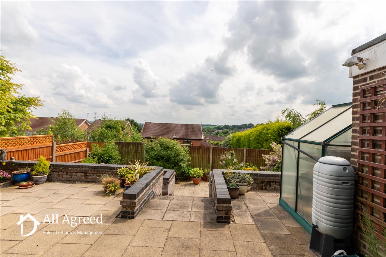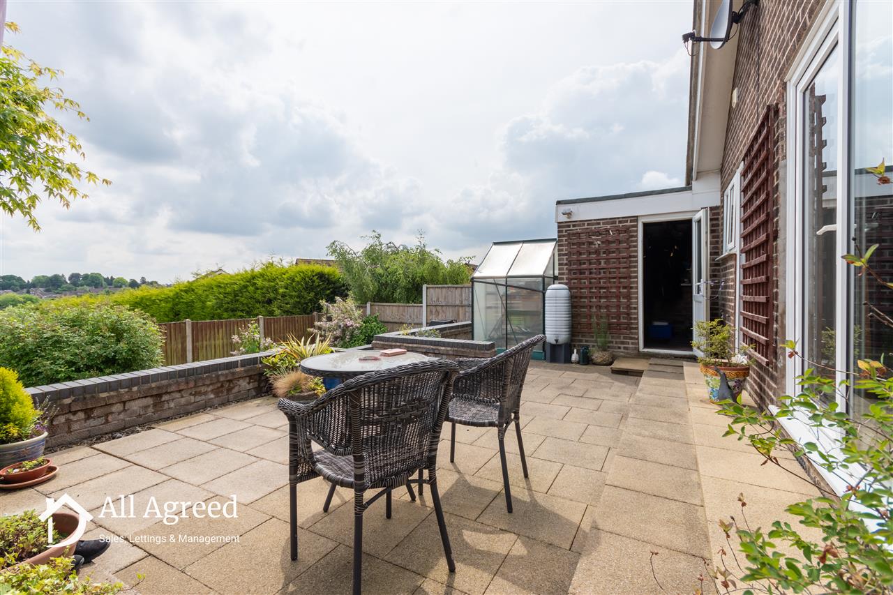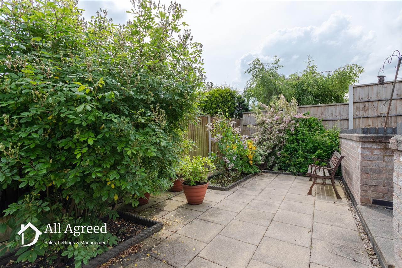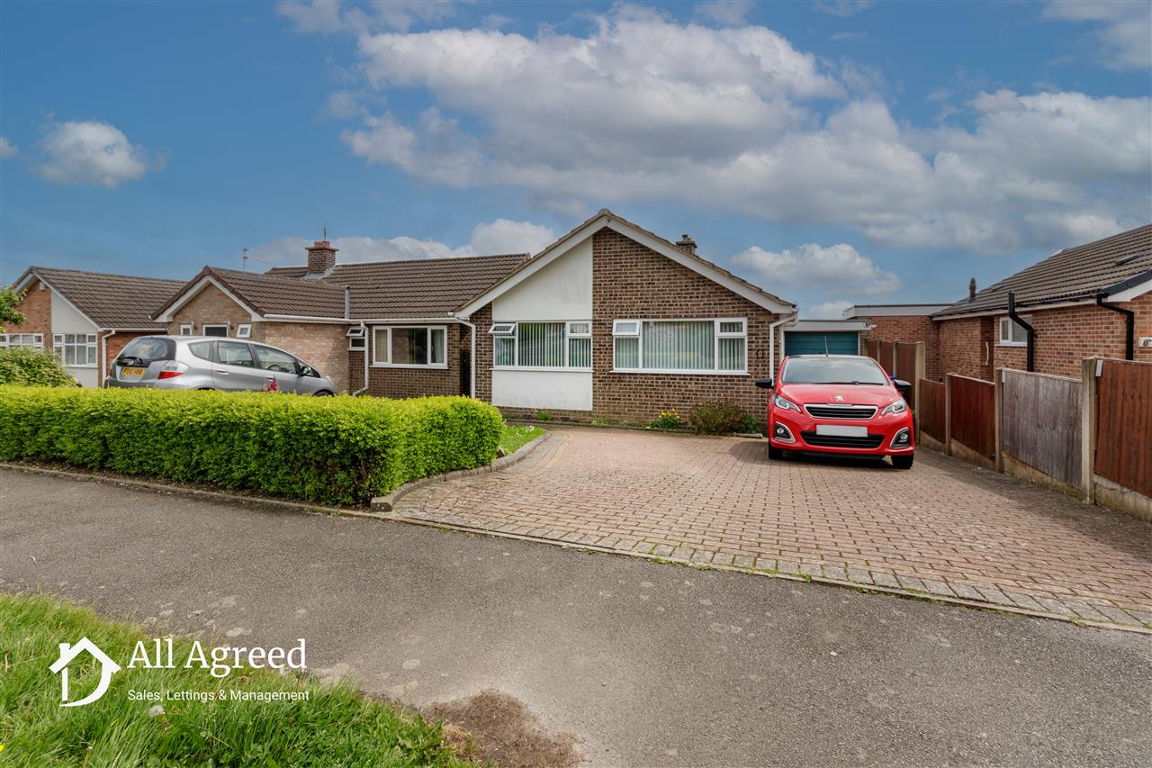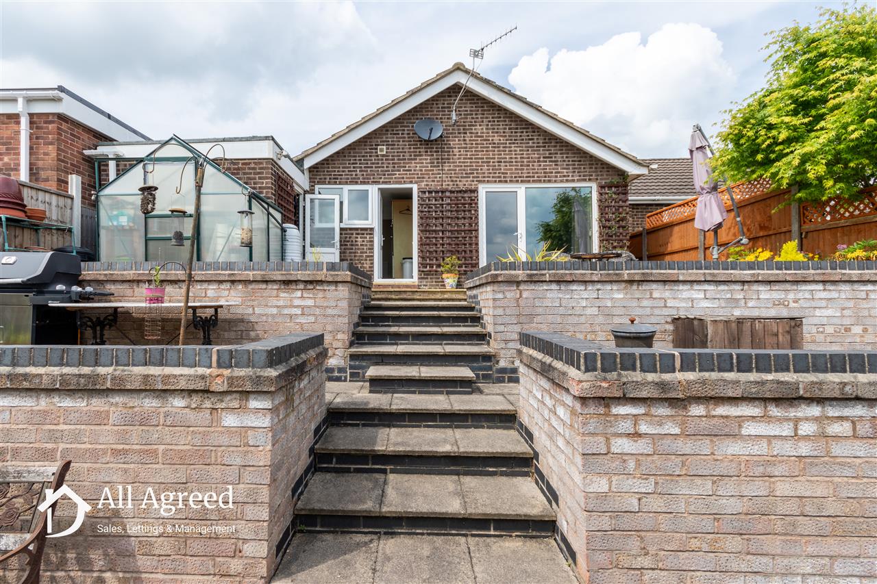To the front elevation there is a block paved driveway providing off road parking, and lawned section with small privet hedge border. The driveway leads down the side of the bungalow to the single garage. To the rear elevation there is an enclosed low maintenance garden which consists of a tiered patio with planting borders.