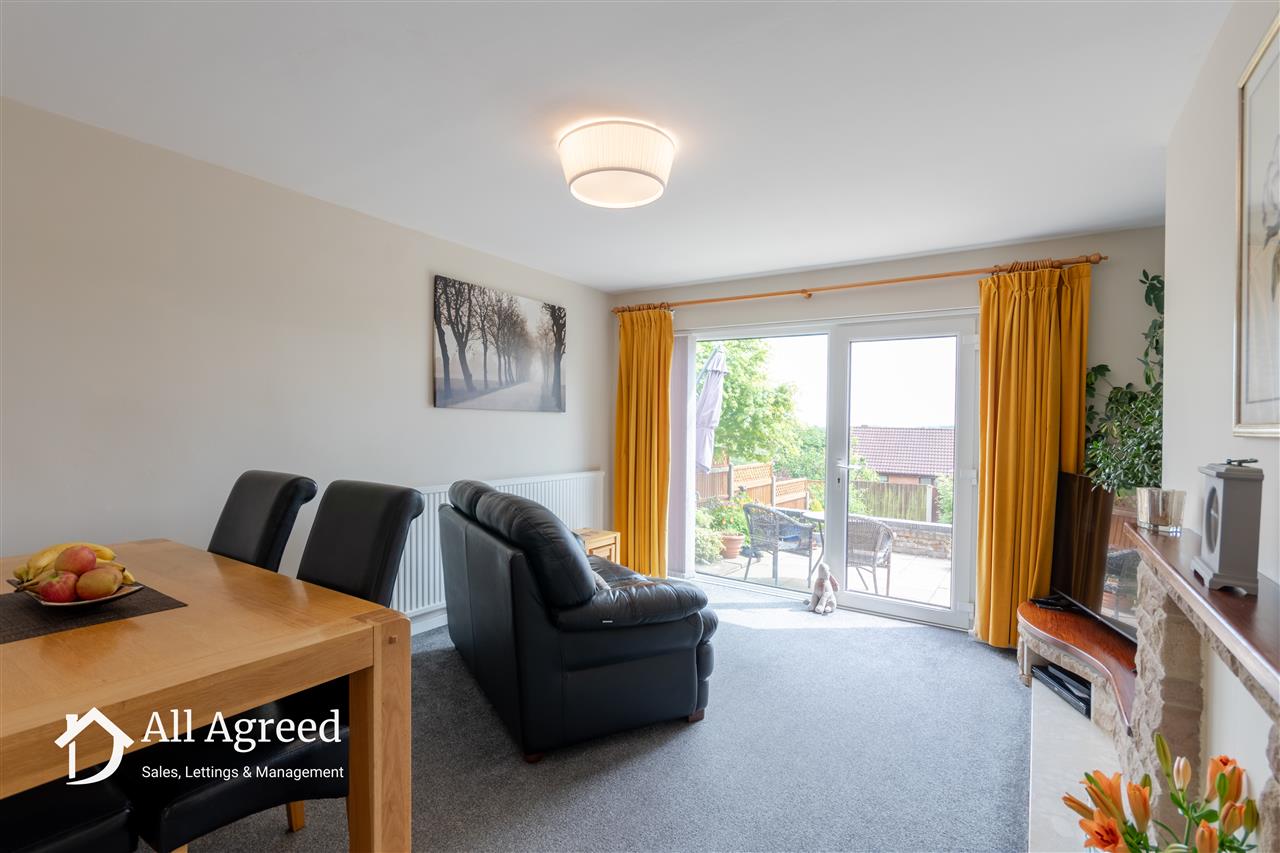 Stone effect fireplace with marble effect hearth, central heating radiator and uPVC double glazed window and door to the rear elevation.