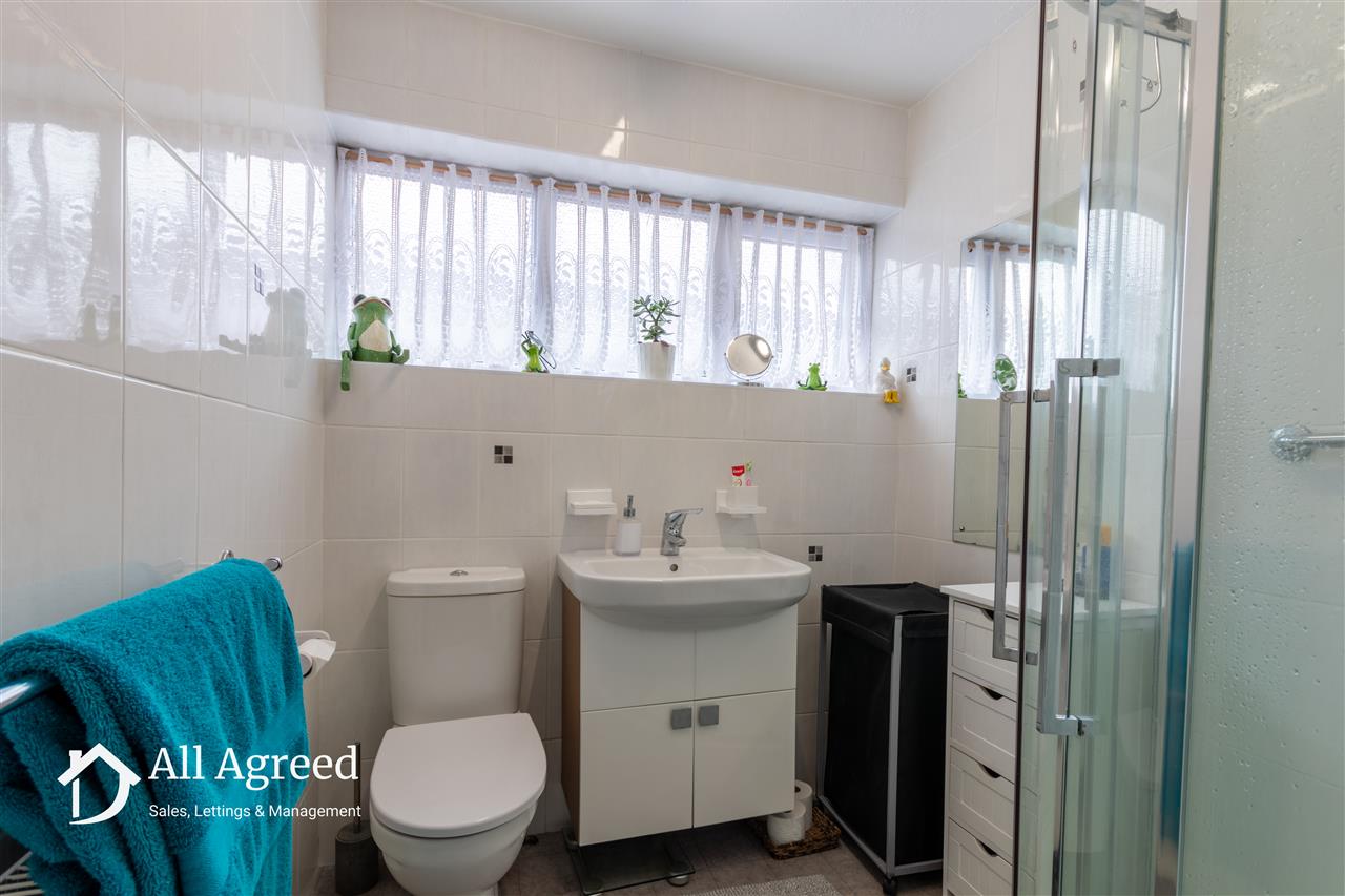Having a white suite comprising corner shower cubicle with electric shower, vanity wash basin and low flush WC, central heating radiator, fully tiled walls, extractor fan and opaque uPVC double glazed window to the side elevation.