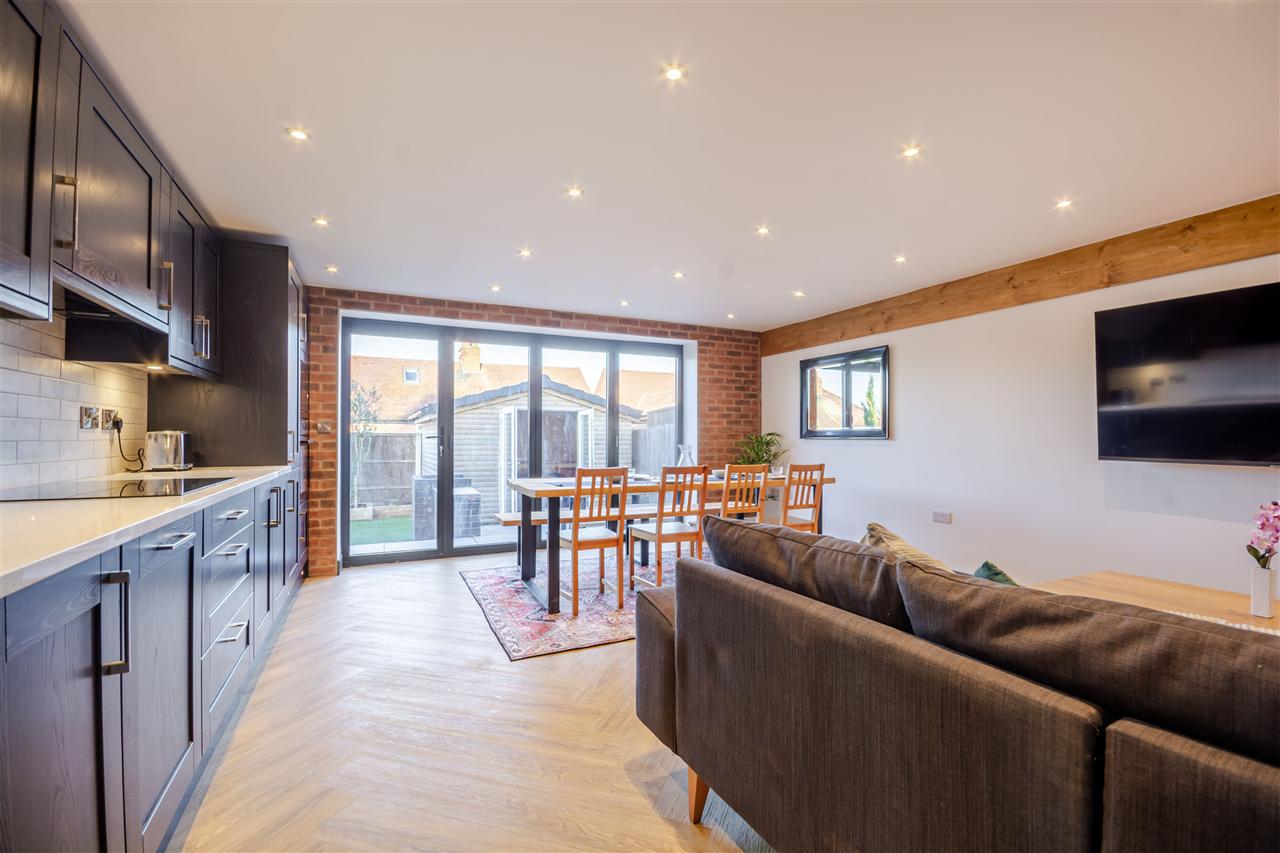 The living and dining areas offer generous space for furniture and benefit from UPVC double glazed bi-fold doors opening directly onto the rear garden. Additional features include wood-effect flooring, multiple power points and recessed ceiling lighting throughout.