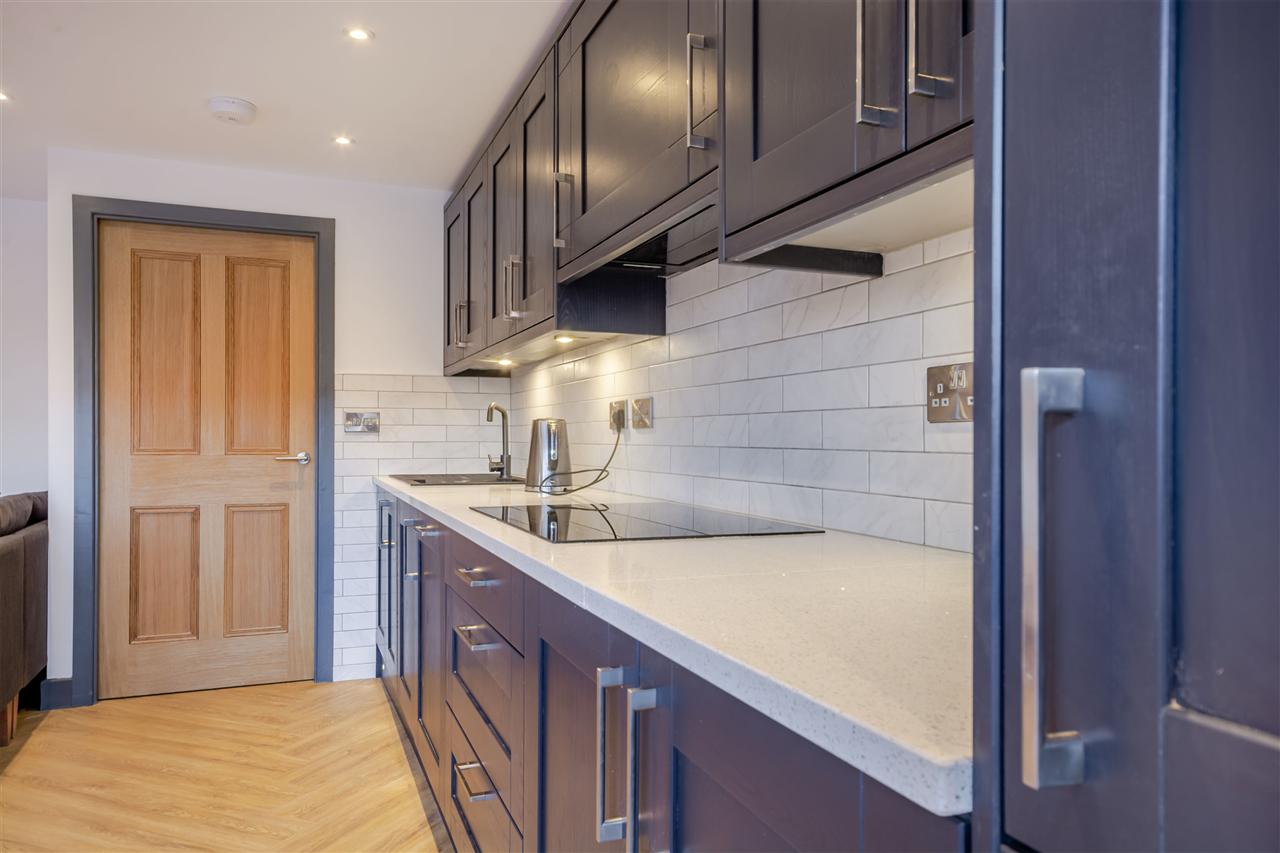 A spacious and well-designed open-plan living kitchen. The kitchen area is fitted with a range of modern wall and base units with complementary work surfaces, integrated appliances, inset sink with mixer tap and tiled splashbacks.