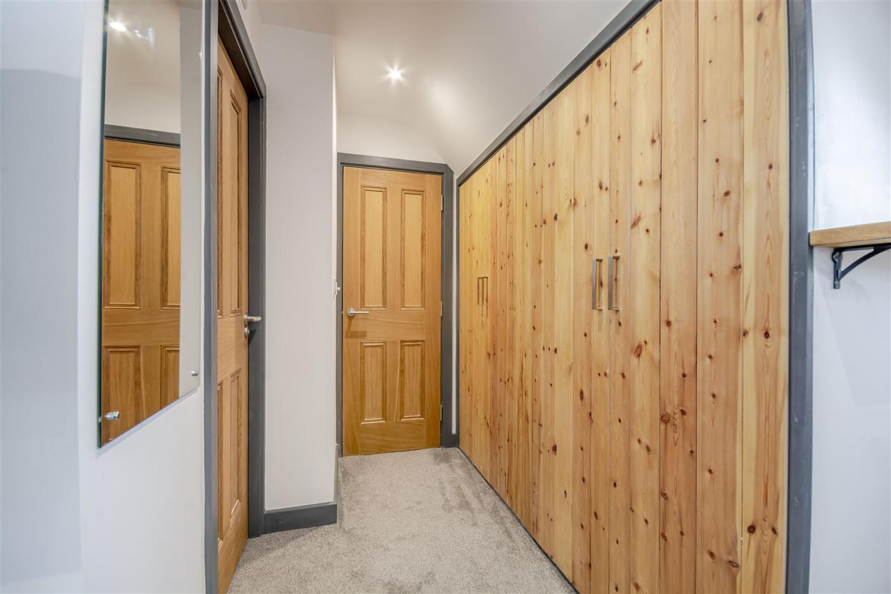 Fitted with a modern three-piece suite comprising a walk-in shower enclosure, wash hand basin and low-level WC. Finished with contemporary wall tiling, tiled flooring, chrome fittings, extractor fan and inset ceiling spotlights.