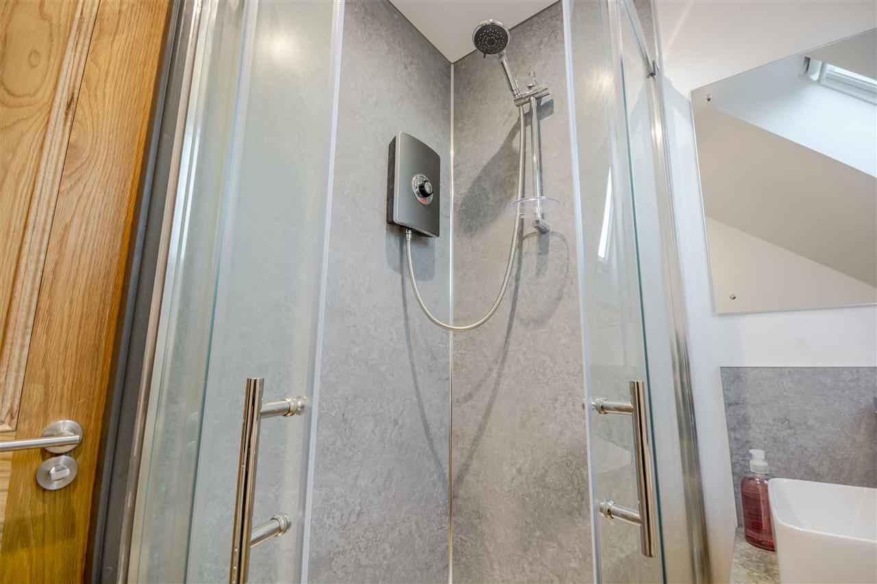 Fitted with a modern suite including shower enclosure, wash hand basin and low-level WC, heated towel rail, extractor fan, ceiling spotlights and Velux window.
