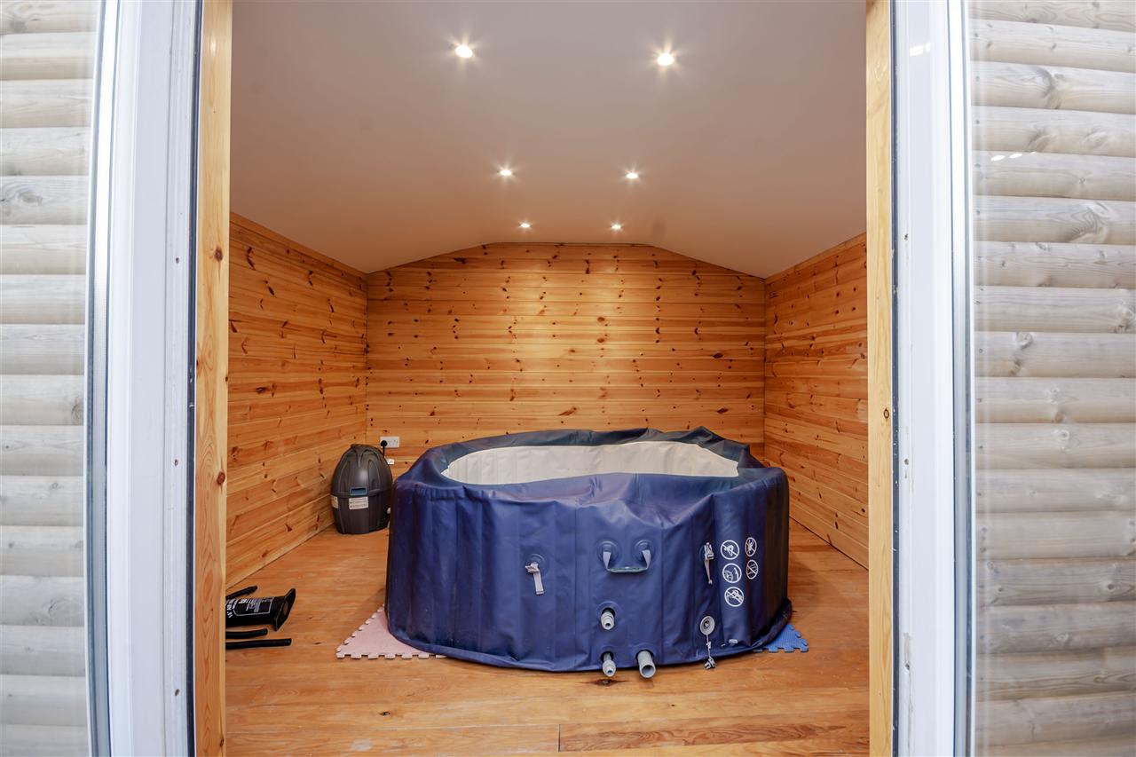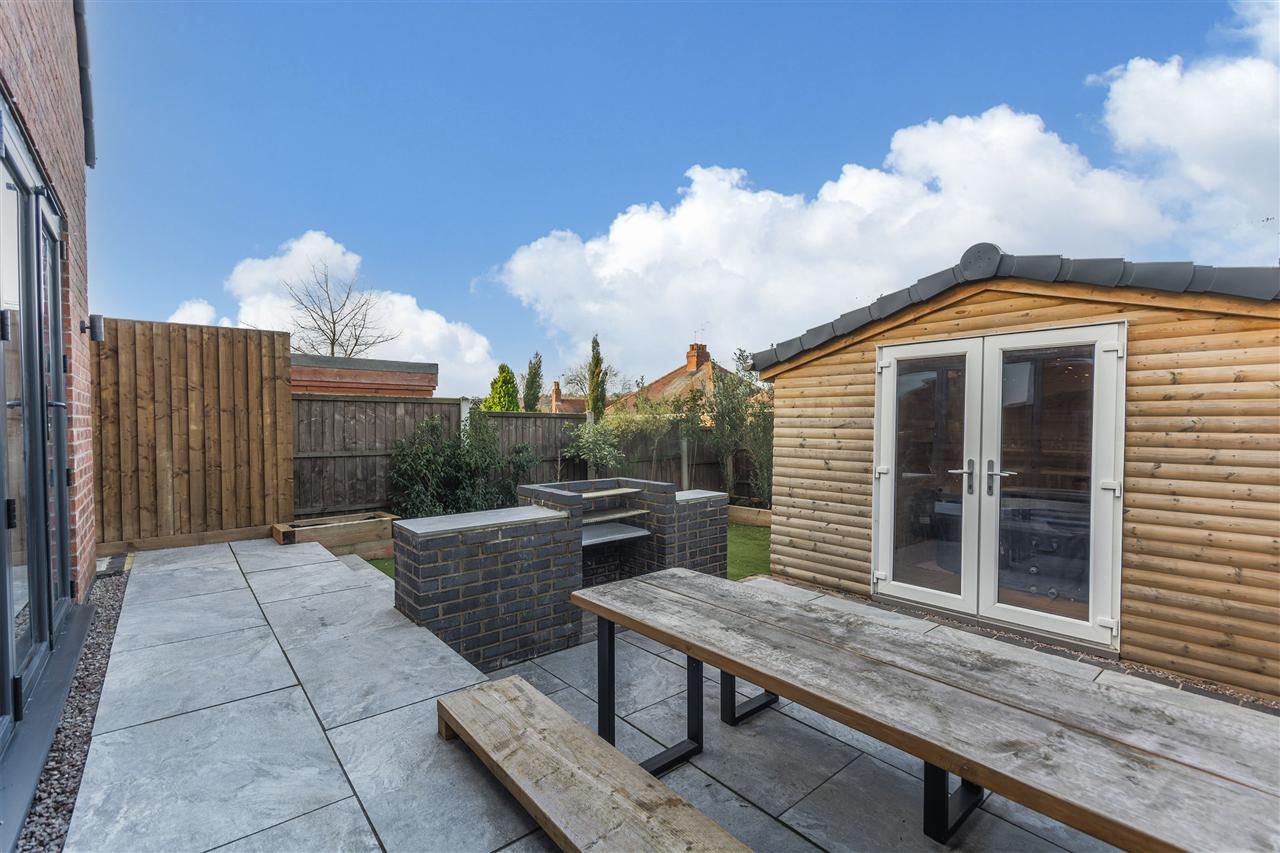 A landscaped, low-maintenance rear garden featuring paved seating areas, artificial lawn, fenced boundaries, external lighting and power points. There is a further covered seating area to the side elevation which also benefits from power and lighting.