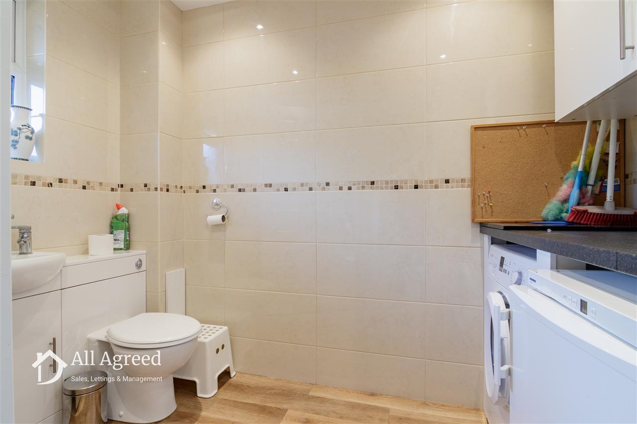 A useful and versatile room fitted with a worktop and wall-mounted cupboard, appliance spaces for a washing machine and freezer, vanity unit with wash basin and WC, tiled/LVT flooring, extractor fan and ceiling spotlights. The room has previously been used as a ground-floor shower room and could easily be reinstated, if required.