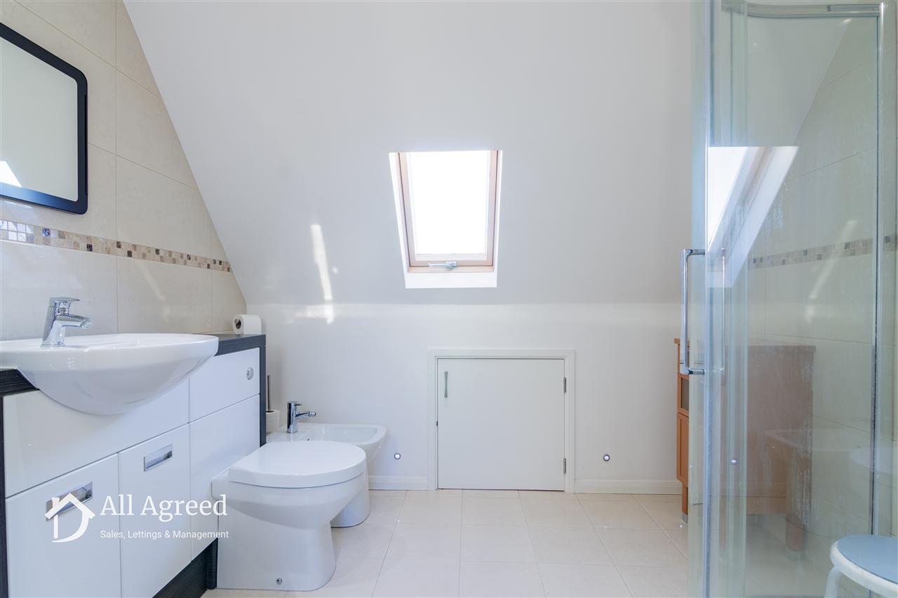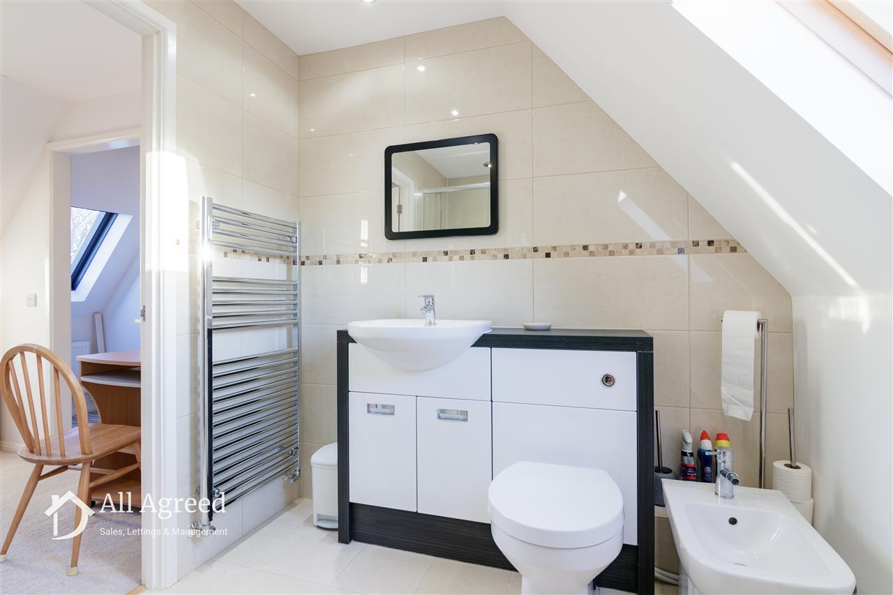 Having a four piece suite comprising spacious shower cubical with thermostatic shower, vanity unit with wash basin and WC, bidet, storage eaves, partly tiled walls, extractor fan, chrome heated towel rail and Velux roof light to the front elevation. a