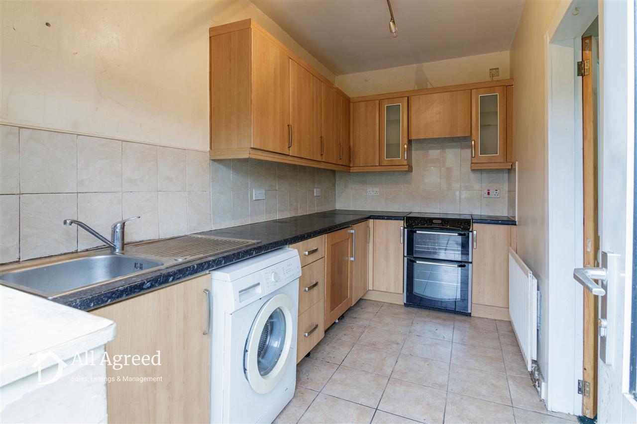 Having fitted wall and base units with rolled edge worktops, tiled splashback, electric oven/grill with four ring hob, stainless steel sink unit with mixer tap, integrated fridge, appliance space for washing machine, tiled floor, central heating radiator and uPVC double glazed window and door to the rear elevation.