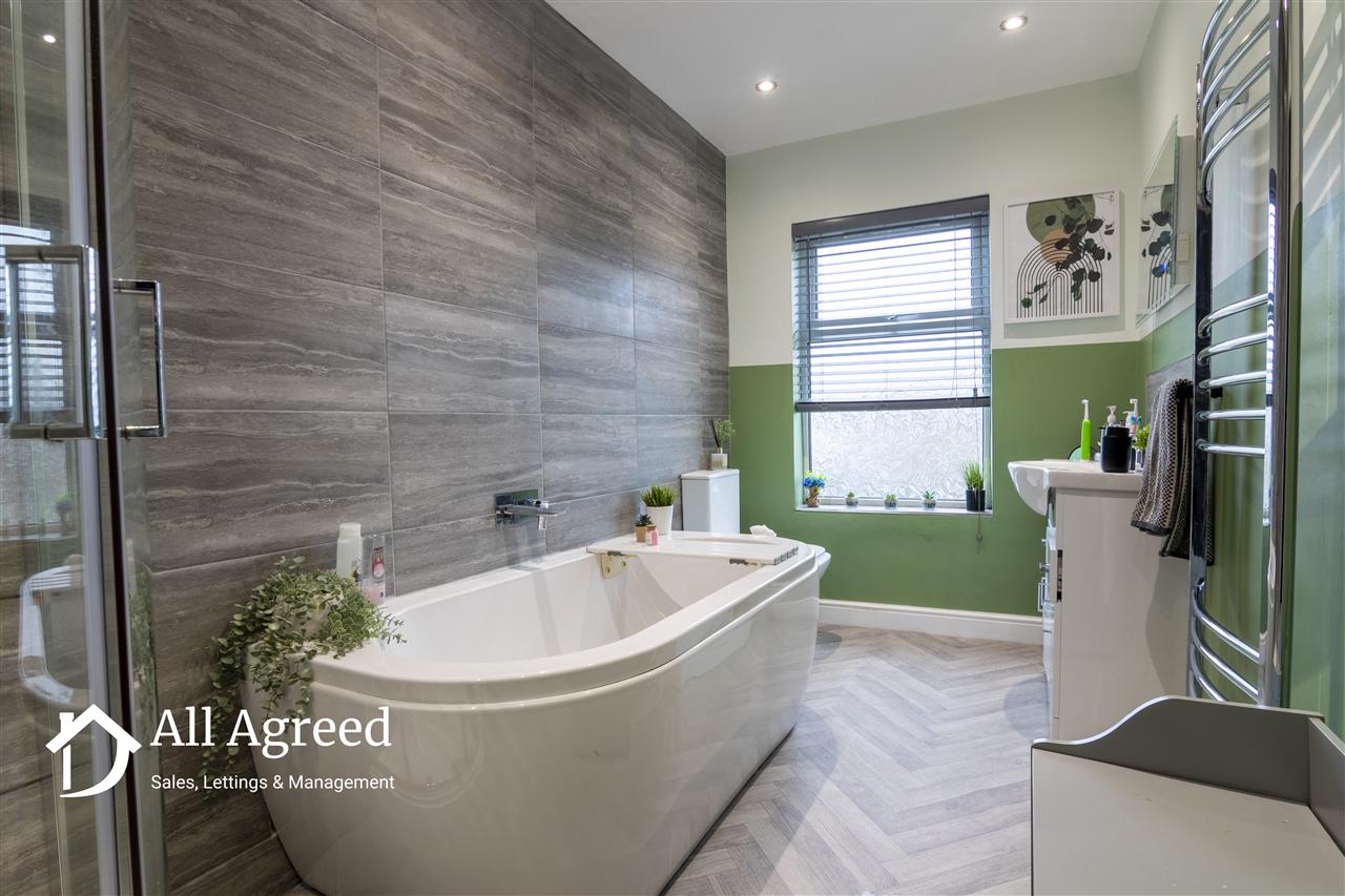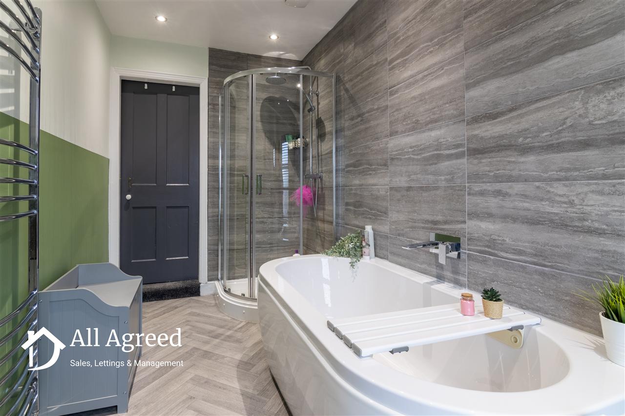 A spacious modern room with a four piece suite comprising shower cubicle with mains thermostatic shower, double ended bath, low flush WC and vanity washbasin, partly tiled walls, chrome heated towel rail, spotlights and opaque uPVC double glazed window to the rear elevation.
