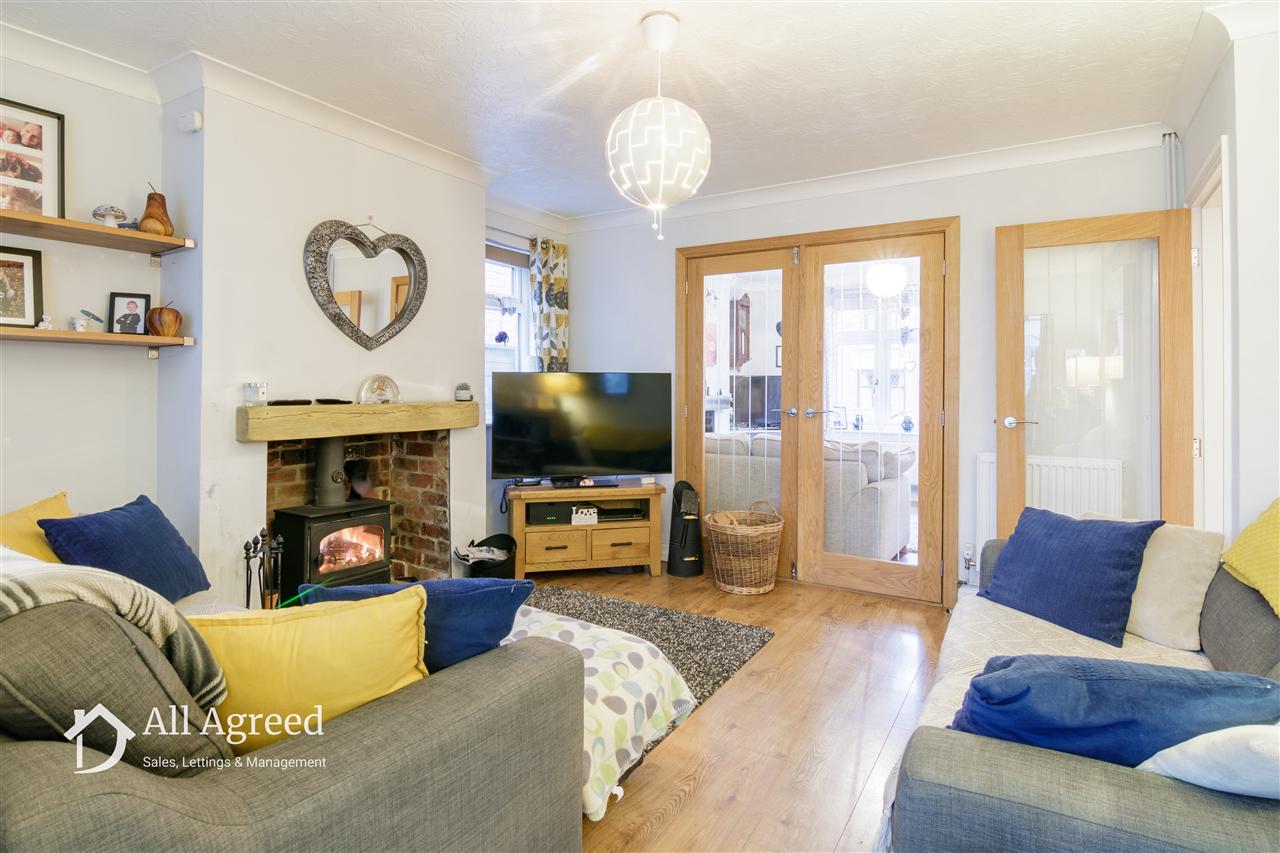 Featuring a multi-fuel stove, ceiling coving, central heating radiator, wood effect flooring, uPVC double glazed window to the front elevation and double glazed internal doors through to the dining room.