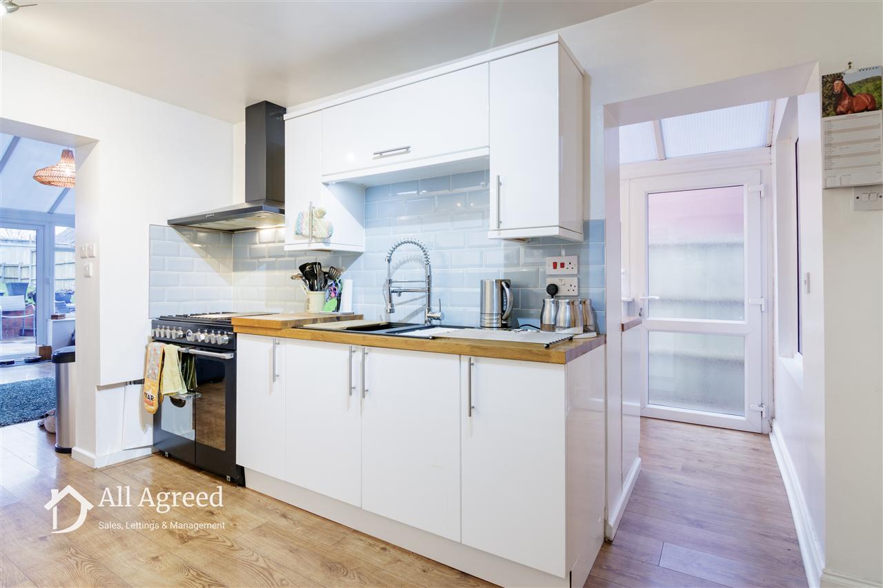 With a range of modern high and low level units with solid wood worktops, complimentary splashback tiling, sink unit with mixer tap, space for range style cooker with extractor hood above, appliance space for a fridge/freezer, under-stairs storage space with power and light, wood effect flooring and access to both the conservatory and utility room.