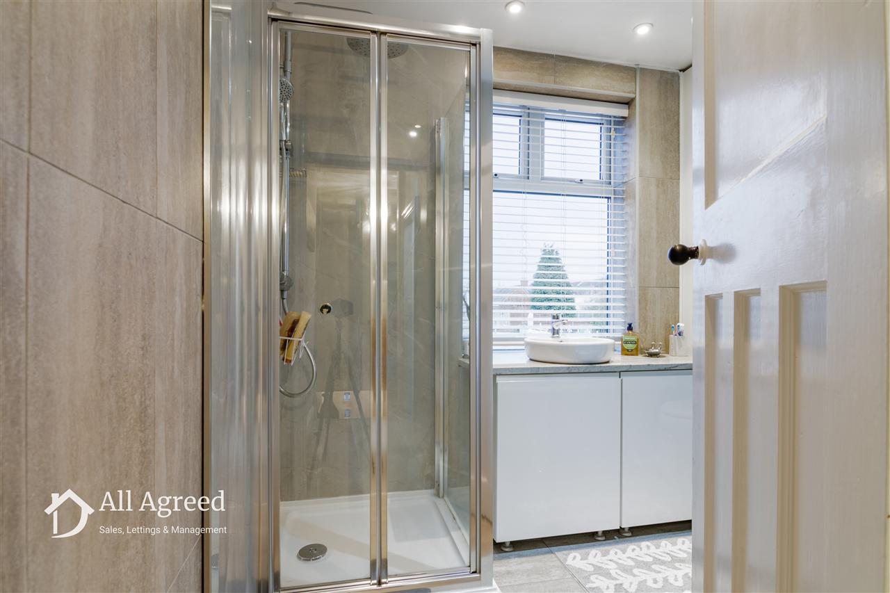 Having a modern four piece suite with double ended roll-top bath, shower cubicle with mains thermostatic twin head shower, vanity unit with bowl-style basin, low flush WC, fitted cupboard housing gas combi boiler (fitted November 2020 and regularly serviced), spotlights, tiled floor, partly tiled walls and opaque uPVC double glazed window to the rear elevation.