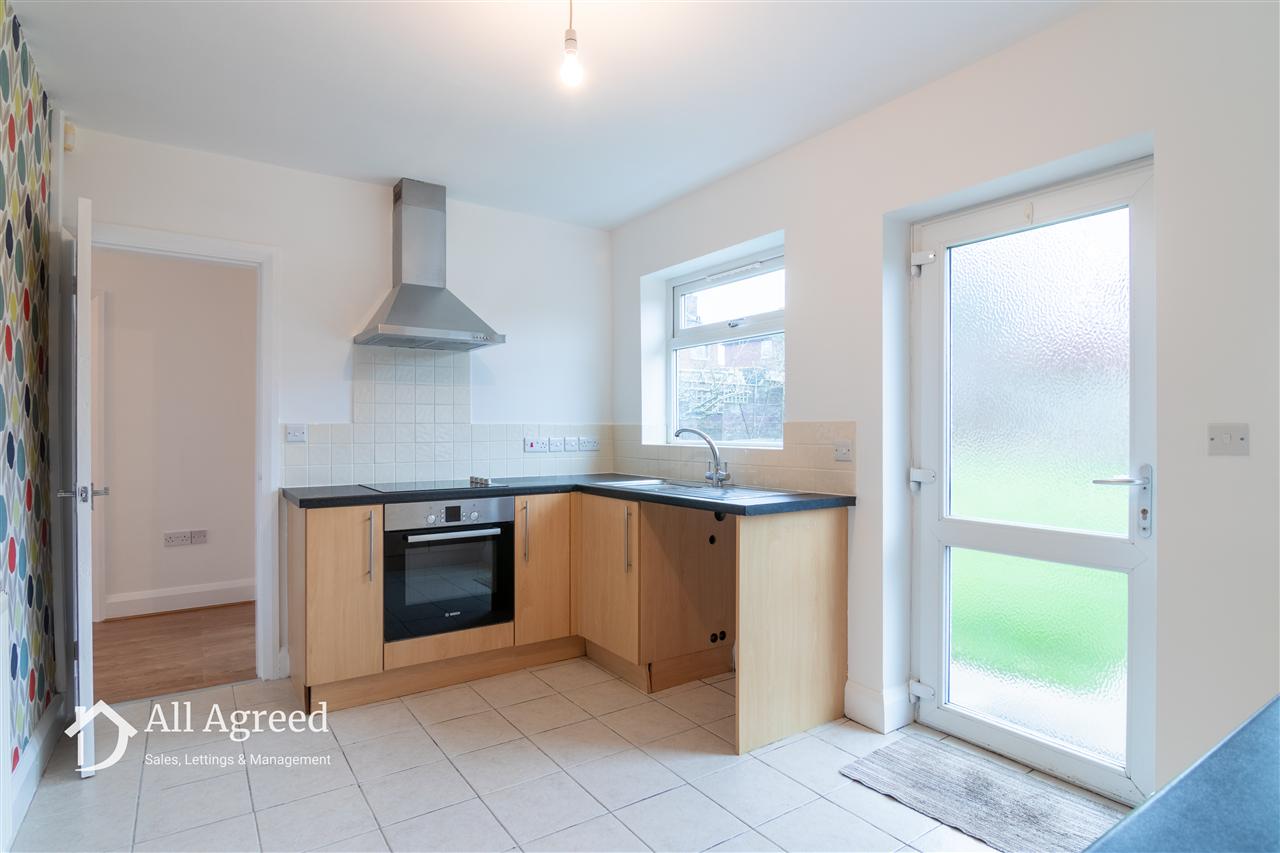 Having a range of fitted wall and base units with rolled edge worktops, electric oven, four ring electric hob with stainless steel extractor hood above, stainless steel sink unit, appliance spaces for washing machine and fridge/freezer, tiled floor, central heating radiator, 2 x uPVC double glazed windows and uPVC double glazed door to the rear elevation.