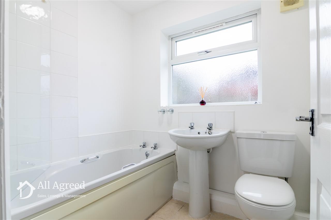 Having a white three piece suite comprising panelled bath with electric shower over and glass screen, low flush WC and pedestal wash basin, partly tiled walls, extractor fan and opaque uPVC double glazed window to the rear elevation.