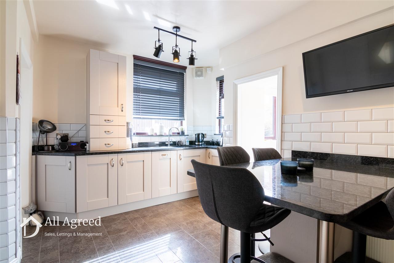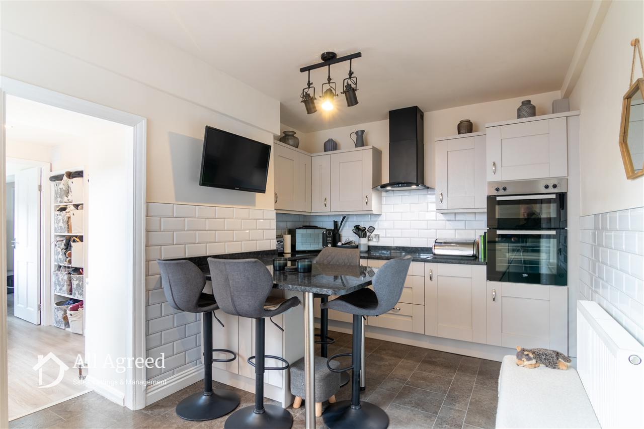 Fitted with a range of high and low level wall and base units with quartz work surfaces and complementary splashback tiling. Appliances include an electric induction hob with extractor hood over, built-in electric oven with grill, and inset sink with mixer tap. There is also a breakfast bar, central heating radiator, and uPVC double glazed window to the side elevation. Access to an understairs storage/pantry cupboard.