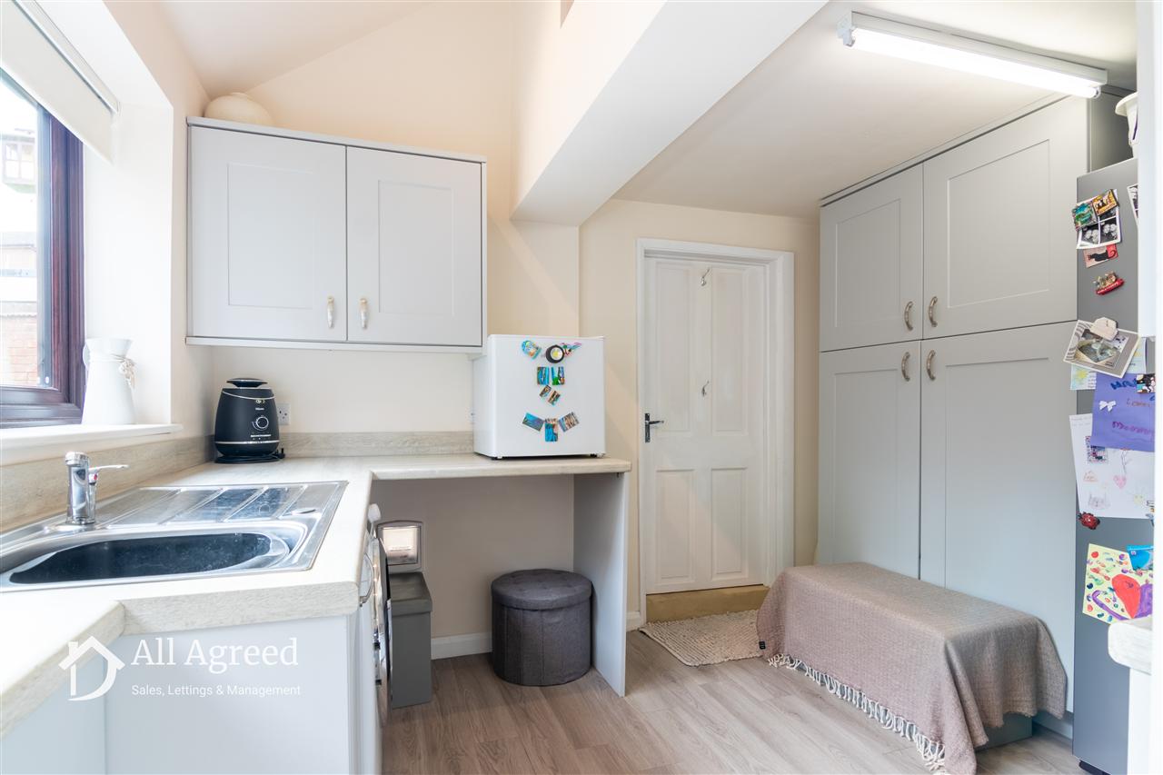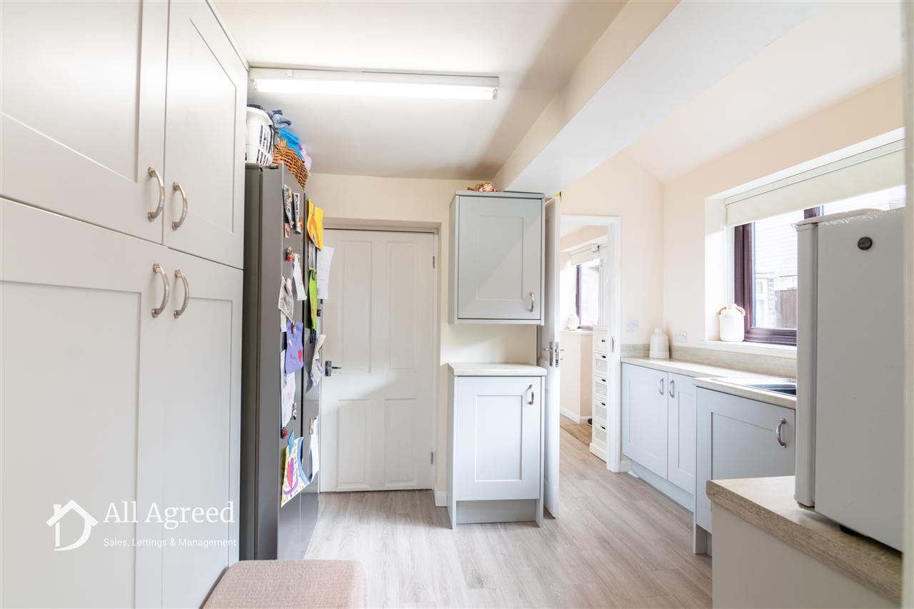 Fitted with a range of high and low level wall and base units with rolled edge worktops, stainless steel sink unit, and appliance space for a washing machine. uPVC double glazed window to the side elevation.