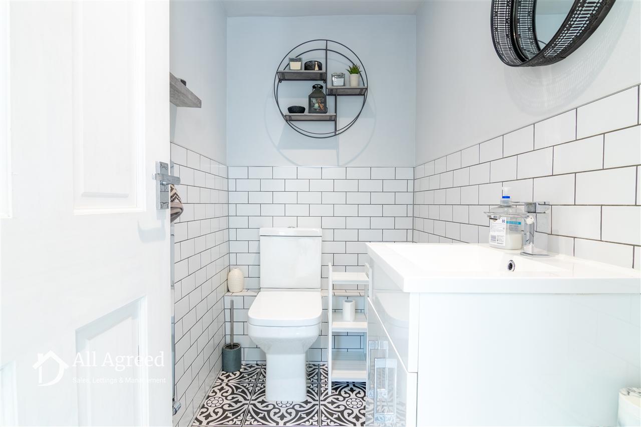 Fitted with a low flush WC and vanity wash basin, complemented by a chrome-effect towel radiator. Featuring part tiled walls, tiled flooring, and ceiling spotlights.