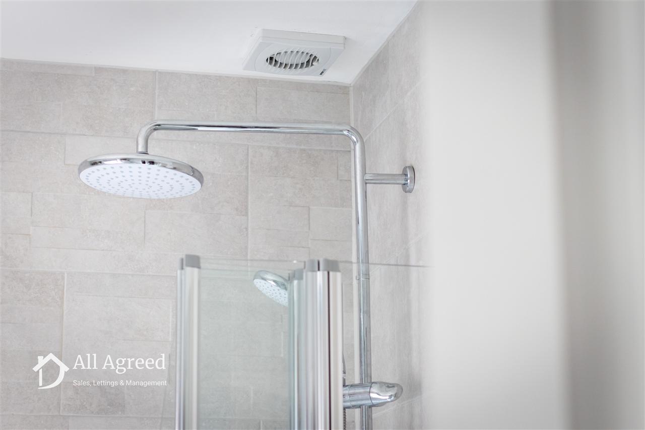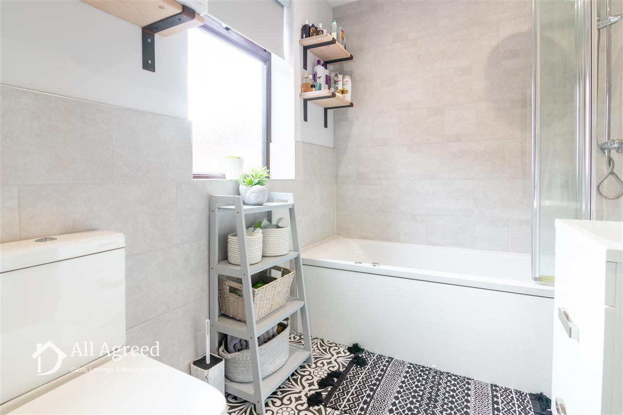 Fitted with a white three-piece suite comprising a panelled spa bath with twin-head mains-fed thermostatic shower over, vanity wash basin, and low flush WC. Finished with partly tiled walls, tiled flooring, heated towel rail, ceiling spotlights, extractor fan, and a frosted uPVC double glazed window to the side elevation.