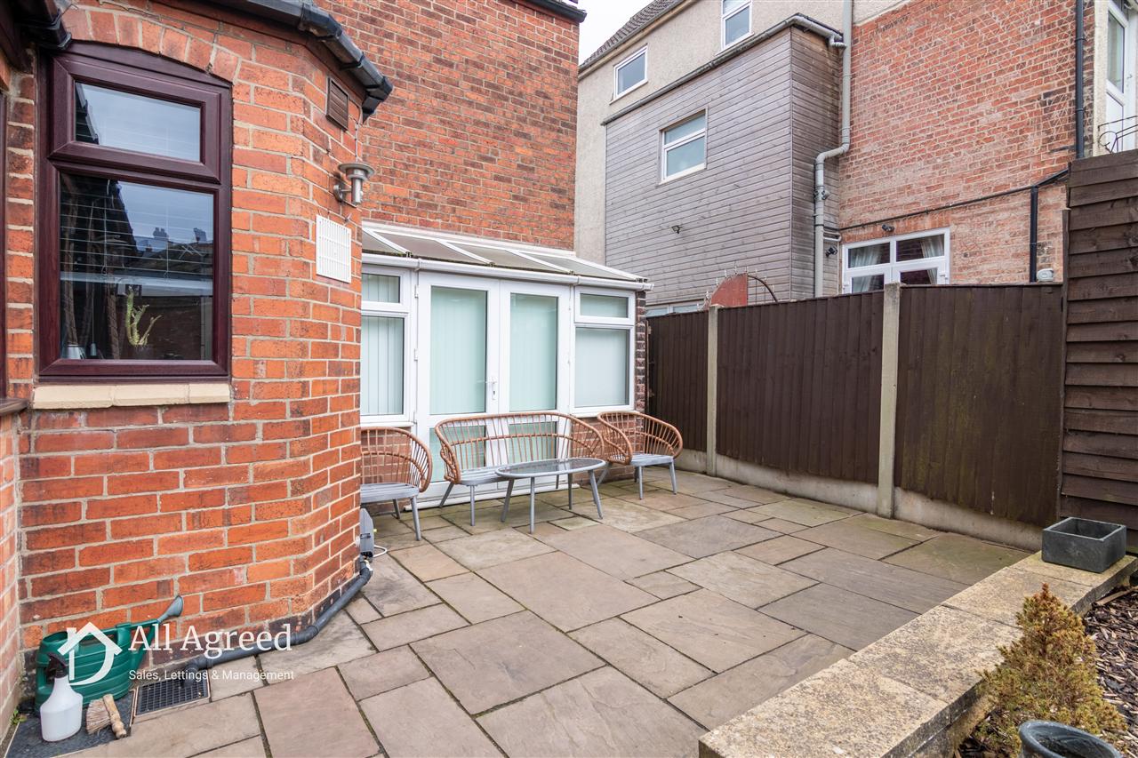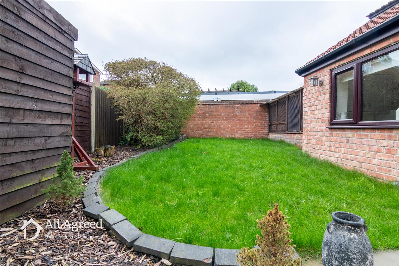 To the rear of the property is an enclosed garden designed for ease of maintenance, featuring a paved patio seating area directly off the conservatory—ideal for outdoor dining and entertaining—alongside a lawned section with raised borders. The space is well contained with fenced boundaries, offering a good degree of privacy.