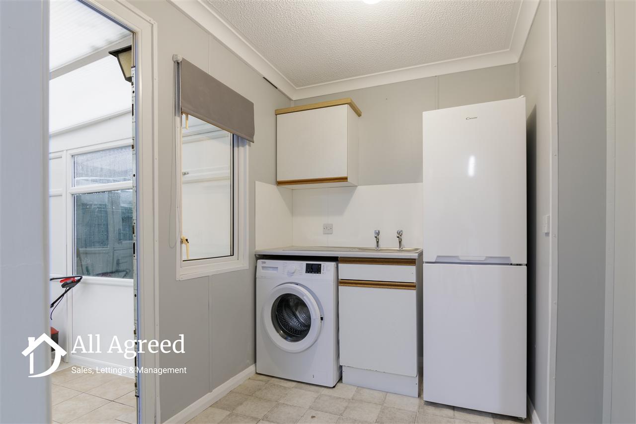 With sink unit, wall and base cabinet, washing machine, fridge/freezer and central heating radiator.