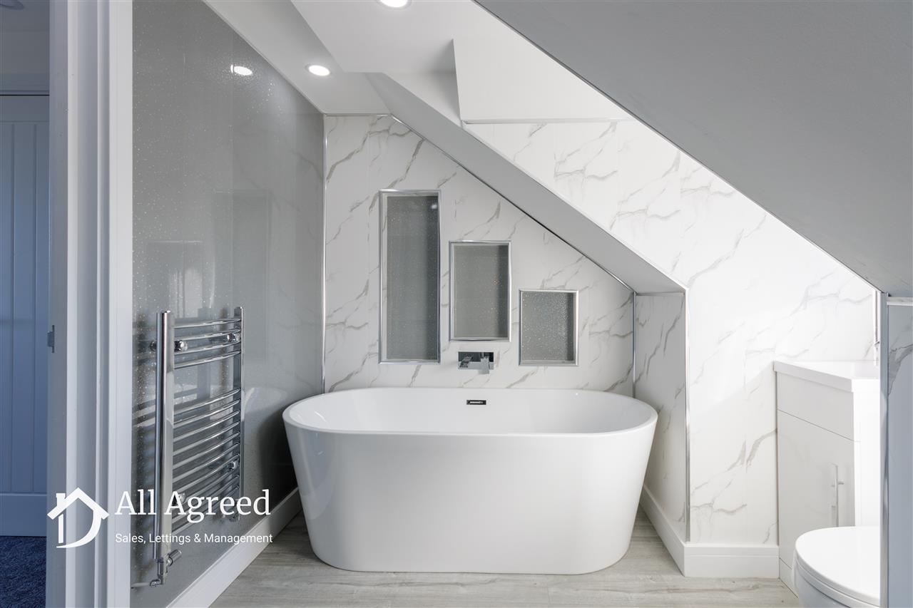Having a four piece suite with double ended bath, shower cubicle with mains water fed shower, vanity unit with wash basin and WC, recessed display shelving, chrome effect heated towel rail, storage eaves, extractor fan and uPVC double glazed window to the front elevation.
