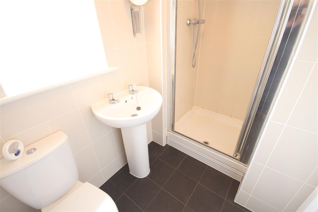 having a white suite comprising low flush WC, pedestal wash basin, shower cubicle with mains shower over and folding glass shower door, shaver point, central heating radiator, fully tiled walls, lino flooring and opaque double glazed window to rear elevation.